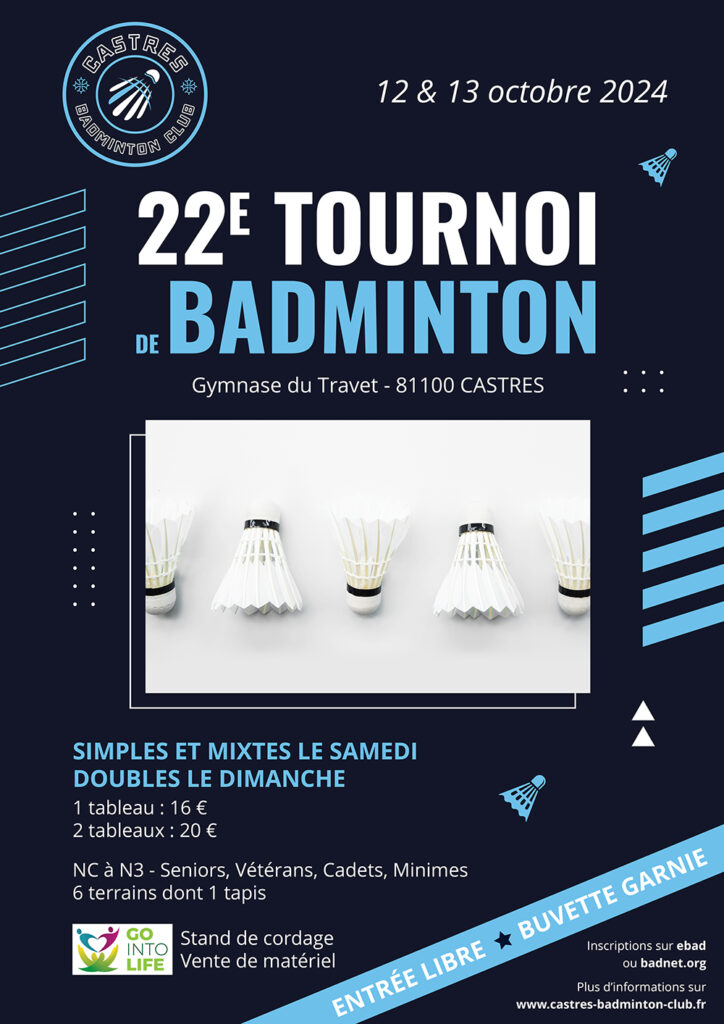 Notre partenaire GoIntoLife tiendra un stand de cordage et de vente de matériel de badminton.