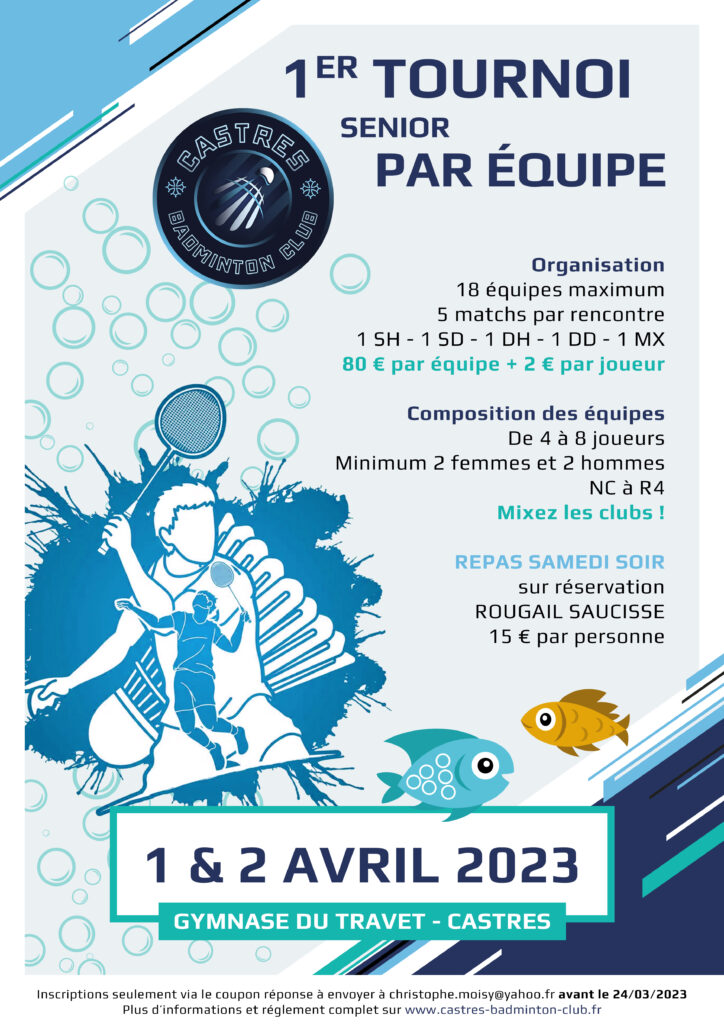 Devant le manque d’inscriptions (seulement 10 équipes sur les 18 attendues), nous sommes contraints de vous annoncer l’annulation du 1er tournoi par équipe de Castres qui devait se tenir les 1er et 2 avril prochains.